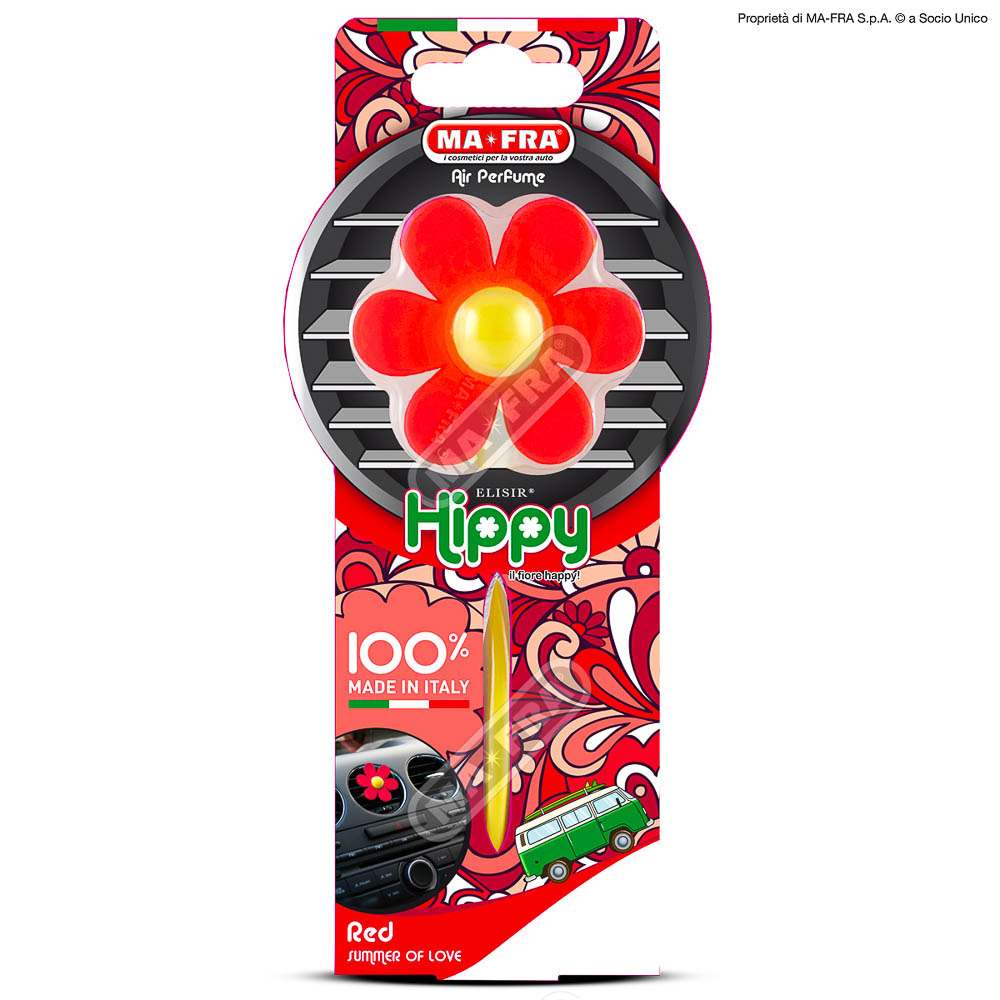 HIPPY SUMMER OF LOVE – PARFUM AROMATIQUE en rouge est le désodorisant pour voiture de MA-FRA de la collection ultra colorée HIPPY.