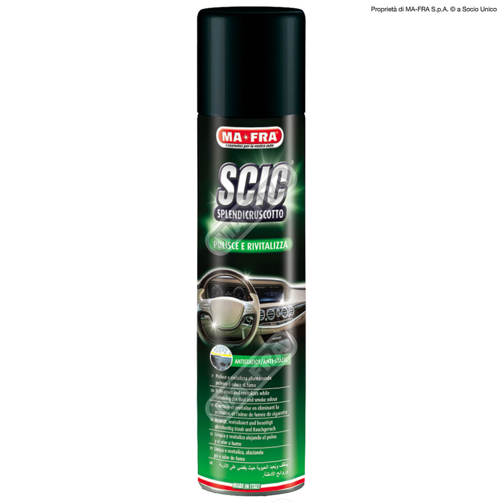 SCIC GREEN est le produit pour faire briller les tableaux de bord et l’intérieur des voitures de MA-FRA, conçu pour le nettoyage des tableaux de bord avec action assainissante, avec effet anti-fumée, spécial pour les inserts en aluminium.